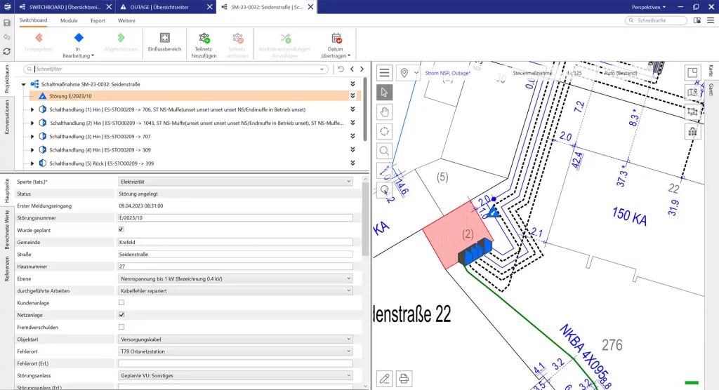 Die von einer Schalt- und Stellmaßnahme betroffenen Betriebsmittel, wie Hausanschlusskästen, Hauptabsperreinrichtungen, Kabel- und Leitungsabschnitte, lassen sich in Lovion SWITCHBOARD automatisch ermitteln und speichern. Sie dienen zum Beispiel dazu, Kunden über bevorstehende Abschaltmaßnahmen zu informieren. Die interaktive Listendarstellung bietet dem Anwender eine hohe Flexibilität bei der Auswahl der relevanten Daten.