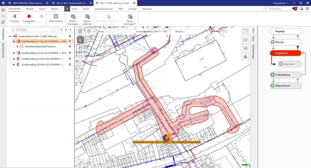 Schalt- und Stellmaßnahmen in Lovion SWITCHBOARD haben Raumbezug. Der Anwender erkennt über den Einflussbereich die Ausdehnung einer Schalt- und Stellmaßnahme im Netz. Die farbliche Darstellung des Einflussbereiches repräsentiert den aktuellen Status im Statusmodell. Darüber hinaus lässt sich Lovion SWITCHBOARD ideal mit den bewährten Lovion SMART TAGS kombinieren. Die konfigurierbaren Lovion SMART TAGS ergänzen die Darstellung von Schalt- und Stellmaßnahmen im Planwerk um zusätzliche Information, wie der Name der Maßnahme sowie geplante und durchgeführte Schalt- und Stellzeiten.