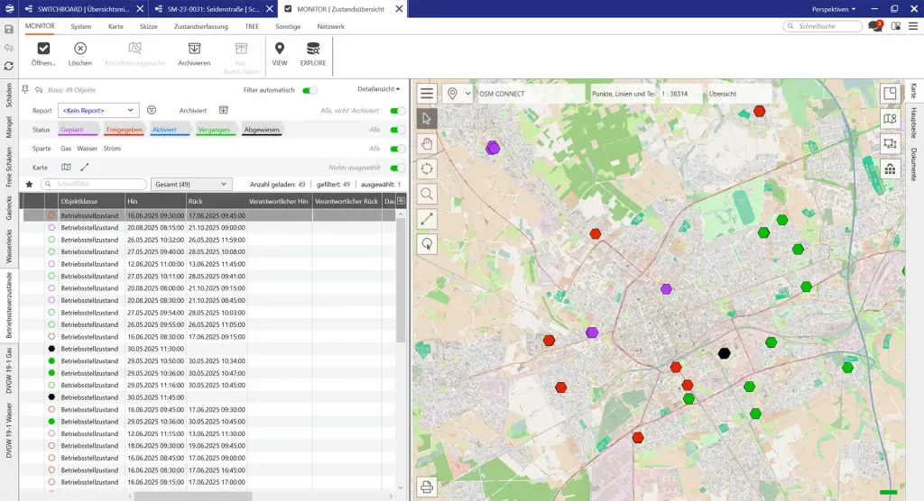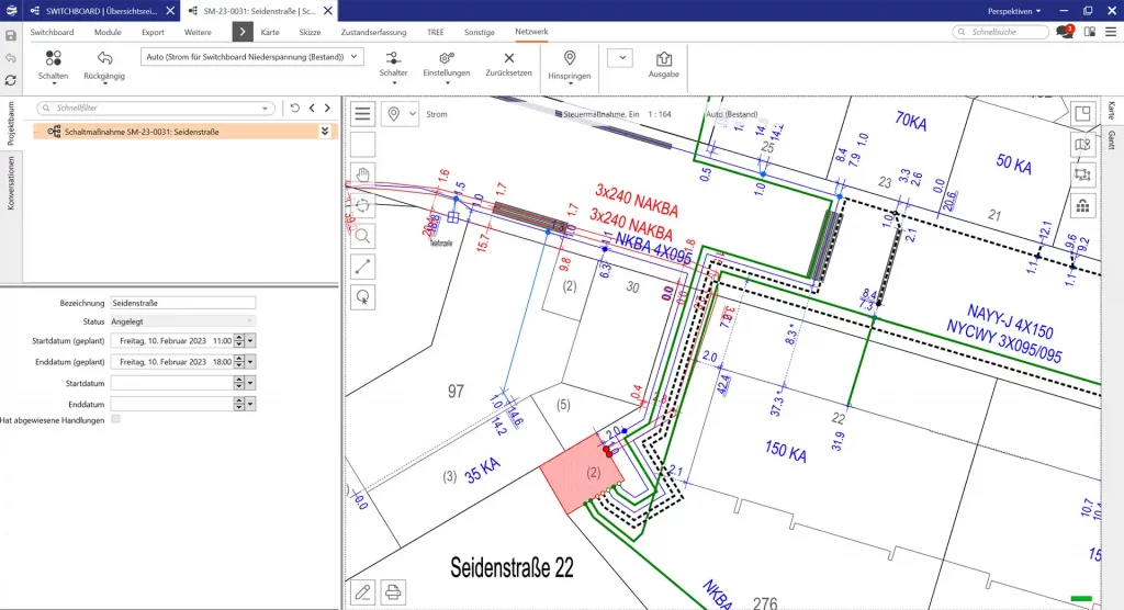 In Lovion SWITCHBOARD werden neben angeschalteten und abgesperrten Netzbereichen weitere betriebliche Zustände dargestellt, die vom Normalzustand abweichen. Hierzu zählen im Strom die Planung und Durchführung von Maßnahmen unter dem Einsatz von Arbeitsschutzsicherungen (AuS) oder der Einsatz einer mobilen Einspeisung, zum Beispiel über einen externen Generator. In den Rohrnetzsparten lassen sich Maßnahmen planen und durchführen, die unter gedrosselter Einspeisung erfolgen. Dies ist im Hinblick auf die Verfügbarkeit von Hydranten ein wichtiger Aspekt. Die unterschiedlichen betrieblichen Zustände werden in Lovion SWITCHBOARD und im Planwerk dargestellt.