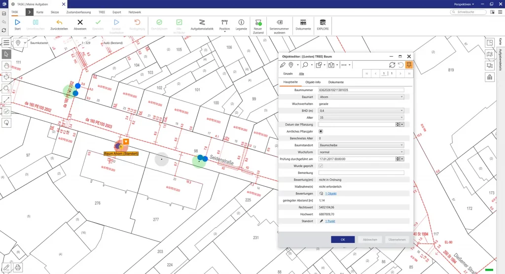 Mit dem Produkt Lovion TREE kann die Baumart, Baumalter, Brusthöhendurchmesser, Wurzelform, Wuchsform und oberirdisches Wuchsverhalten dokumentiert werden. Diese Baumdaten in Verbindung mit den Rohrleitungsdaten wie Material, Nennweite, Deckung und Alter sind wichtige Parameter zur Bestimmung des Gefährdungspotenzials. Mit diesen Daten wird die Gefährdungsabschätzung vorgenommen. Hierbei werden die erfassten Daten durch den Baumgutachter mit den visuellen Eindrücken des Baumstandortes verglichen, um eine Einteilung in die erforderliche Gefahrenklasse zu ermöglichen. Vorschläge zu erforderlichen Sicherungsmaßnahmen können je gepflegtem Baumstandort verwaltet werden.