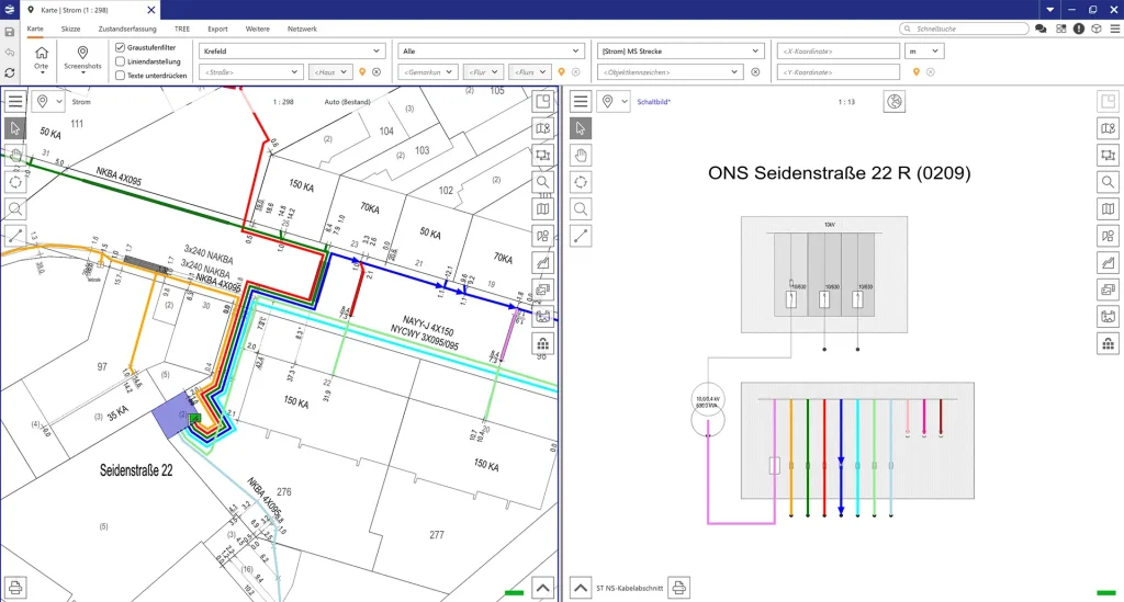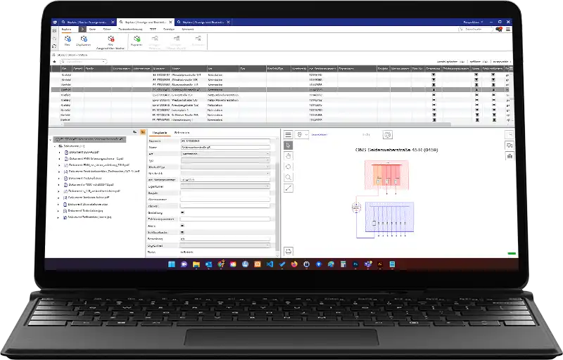 Zur Beauskunftung und Analyse der Sachdaten steht mit Lovion EXPLORE ein Modul zur Verfügung in dem eine Objektliste sowie eine Baumdarstellung über die Objektstruktur erstellt werden kann. Zu jedem Objekt können dann auch direkt die Sachdaten im integrierten Editor und die grafischen Daten im integrierten Grafikfenster angezeigt werden.