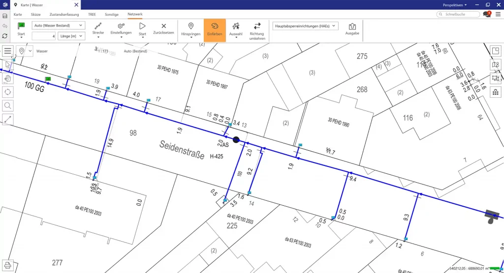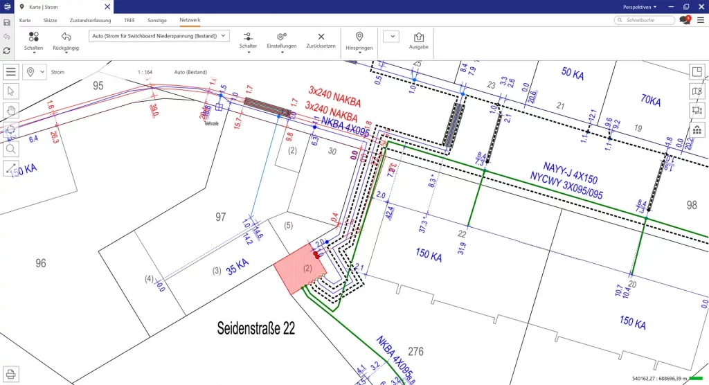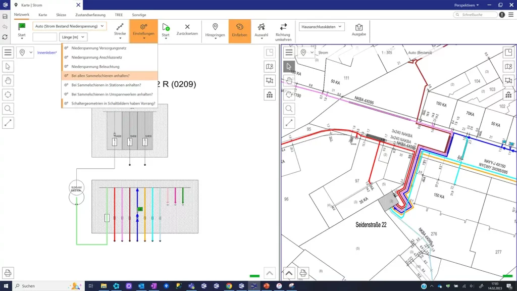Die Netzverfolgung in Lovion ist für die Anforderungen von Netzbetreibern optimiert. Alle Funktionen sind in der Benutzeroberfläche an zentraler Stelle zusammengefasst. Einstellungen, wie die Vorgabe von Leitungslängen, zum Beispiel für die Fehlerortung, Berücksichtigung von Schalterstellungen und Schieberpositionen für die Ermittlung von Speisebereichen sowie die Unterscheidung des Normalzustandes und des aktuellen Zustandes der Netztopologie sind praxisnahe Beispiele.