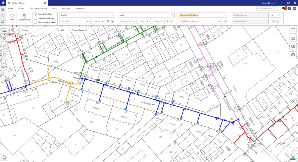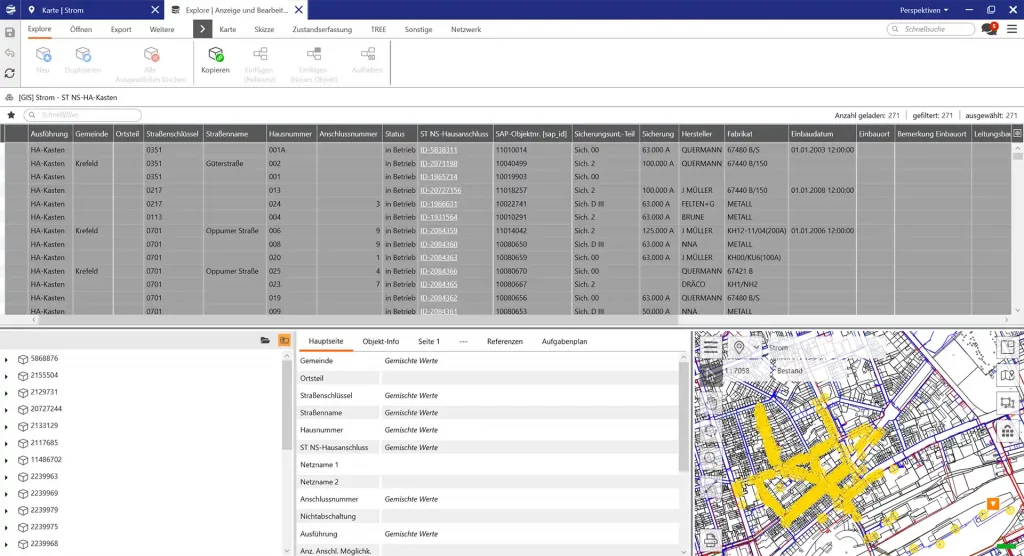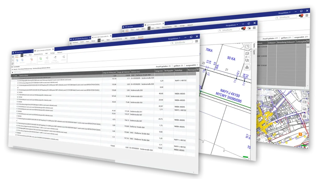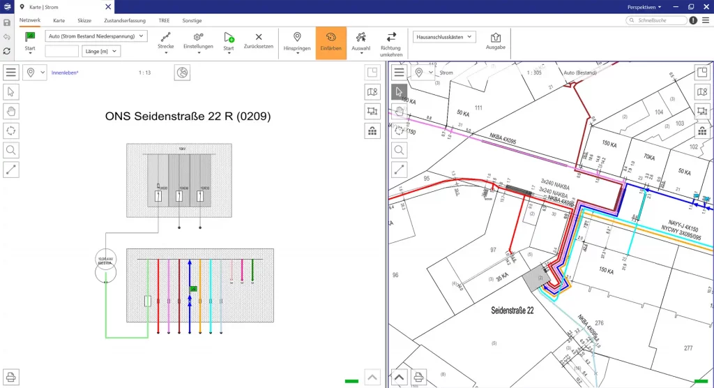 Die Ergebnisse der Netzverfolgung werden in den Planwerken und Anlagenansichten dargestellt. Die schnelle und eingängige Bedienung der Lovion Kartenansichten erlaubt dem Anwender, gezielt auf die Übersicht als auch die Details der Analyseergebnisse zuzugreifen. Mit der interaktiven, geteilten Kartenansicht lassen sich Übersichten und Detailergebnisse in verdichteten Netzbereichen transparent darstellen.
