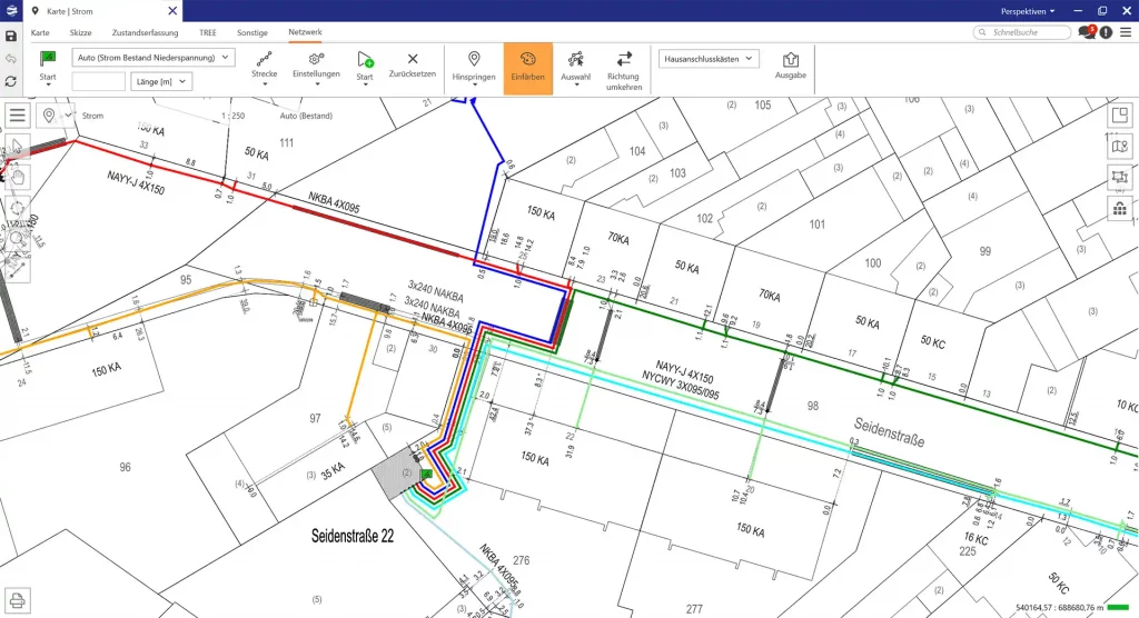 Netzverfolgungen lassen sich auf einzelne Schaltkreise oder Netzbereiche anwenden. Für die Ermittlung von Speisebereichen einzelner Anlagen dehnt sich die Analyse leicht über einen größeren Bereich aus. Die dynamische Einfärbung in Lovion ANALYZER färbt die einzelnen Bereiche dieser Netzbereiche in unterschiedlichen Farben ein. Der Anwender erkennt die Bereiche im Planwerk auf einen Blick. Ergänzt wird die Funktion um das bewusste Ausgrauen von Netzdaten, Anlagen und Beschriftungen, die für die Analyse nicht unmittelbar relevant sind.