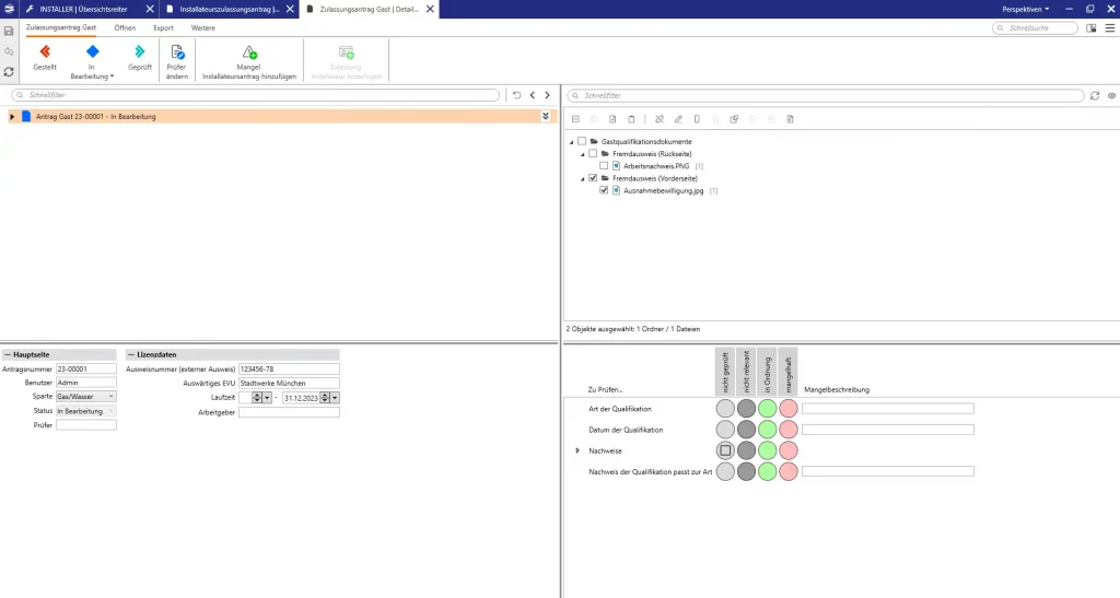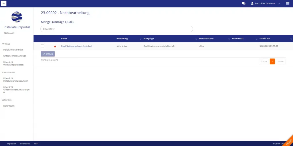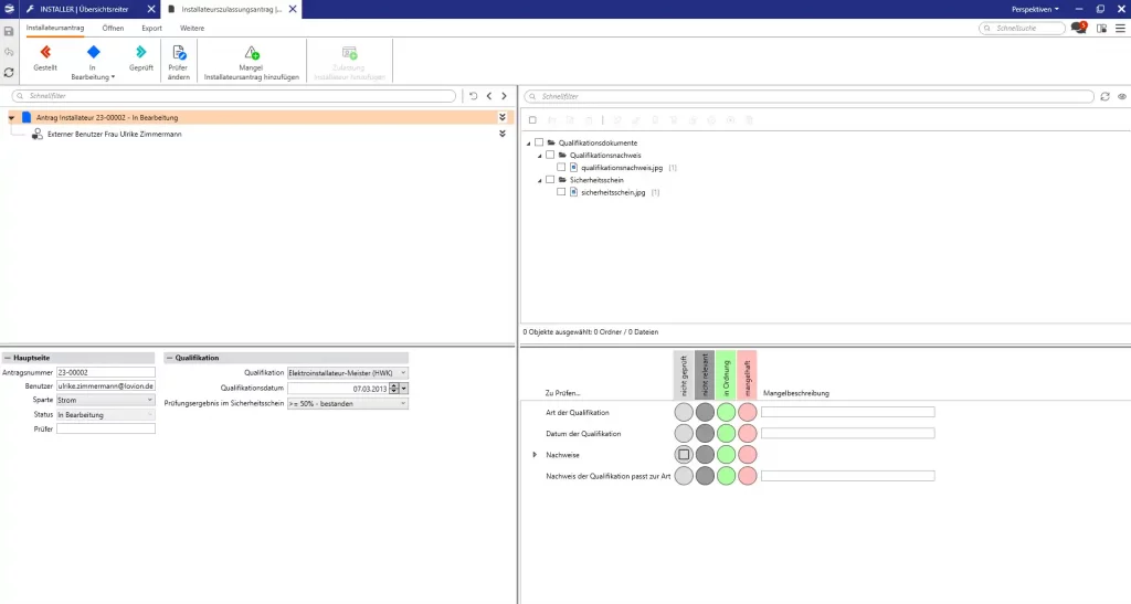 Die Innendienstkomponente Lovion INSTALLER begleitet alle im Rahmen der Konzessionierung von Fachbetrieben und Fachkräften notwendigen Prozessschritte. Sie bietet eine schnelle Sichtung und Bearbeitung der Anträge. Der Mitarbeiter bekommt dabei alle Informationen des Antrags in einer übersichtlichen Maske angezeigt.
