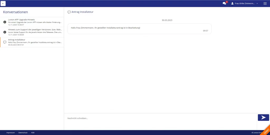 Die Kommunikation zwischen Antragsteller und Bearbeiter kann schnell und transparent durch den Austausch von Informationen und Dokumenten über Lovion INSTALLER PORTAL erfolgen. Dabei können über den in Lovion integrierten Messanger auch Chats ausgetauscht werden. Der Antragsteller bekommt dann automatisch eine Infomail, wenn für ihn neue Nachrichten vorhanden sind.