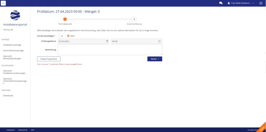 Wenn im Rahmen der Zulassung von Fachbetrieben eine Werkstattprüfung notwendig ist, kann die Terminabstimmung über das Webportal abgestimmt werden. Der Mitarbeiter, der die Prüfung vornimmt, kann die Kontrollergebnisse dokumentieren und, falls notwendig, Mängel anlegen, die dann noch von dem Betrieb zu beheben sind.