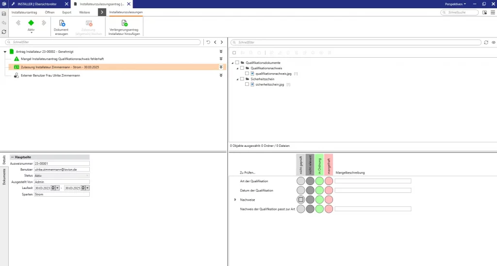 Im letzten Schritt der Antragsbearbeitung kann der Mitarbeiter die Zulassung für den Fachbetrieb bzw. den Installateur erteilen oder die Zulassung verweigern. Bei einer Zulassung erfolgt die automatisierte Aufnahme in das Installateursverzeichnis und es können über Lovion OFFICE CONNECT Ausweis- und Lizenzdokumente erstellt werden.