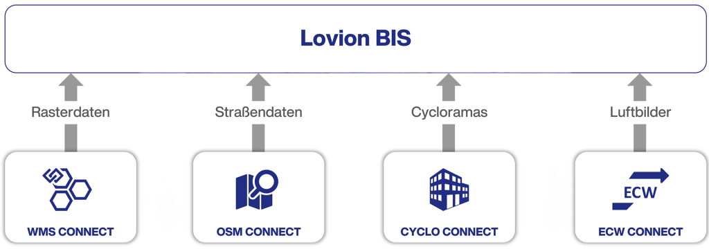 Mit dem Modul Lovion WMS CONNECT kann vom Lovion Client auf WMS Server im Intra- und Internet zugegriffen werden. Der WMS Server stellt die Daten in einem standardisierten Rasterformat zur Verfügung. Die Rasterdaten werden als separater Layer im Themenmenü angezeigt. Das Modul Lovion WMS CONNECT eignet sich vor allem zur Anzeige von allgemeinen Hintergrundkarten, spezifischen raumbezogenen Daten wie Satelliten- und Luftbildern sowie fachbezogenen thematischen Karten, die von Drittanbietern bereitgestellt werden. Sie ergänzen die vorhandenen Planwerke in Lovion um weitere Datenquellen.