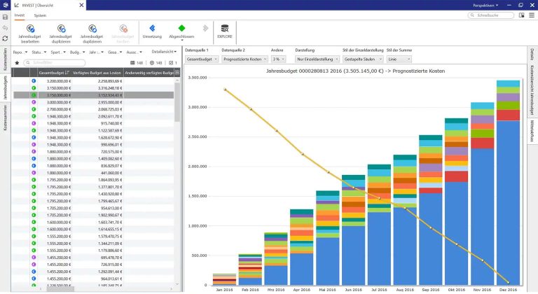 Die Budgetüberwachung geplanter und ungeplanter Maßnahmen kann über das Modul Lovion INVEST erfolgen. Durch die Integration von Lovion INVEST mit dem ERP-System können die im Planungsprozess definierten Schätzkosten den bisher entstandenen IST-Kosten gegenübergestellt werden. Lovion INVEST bildet dabei die Budget- und Kostenstellen-Strukturierung des ERP-Systems nach. Auch mehrjährige Maßnahmen können mittels Zeitscheiben abgebildet werden. Übersichtliche Grafiken ermöglichen ein effektives Controlling und zeigen zum Beispiel den Mittelabfluss grafisch an.