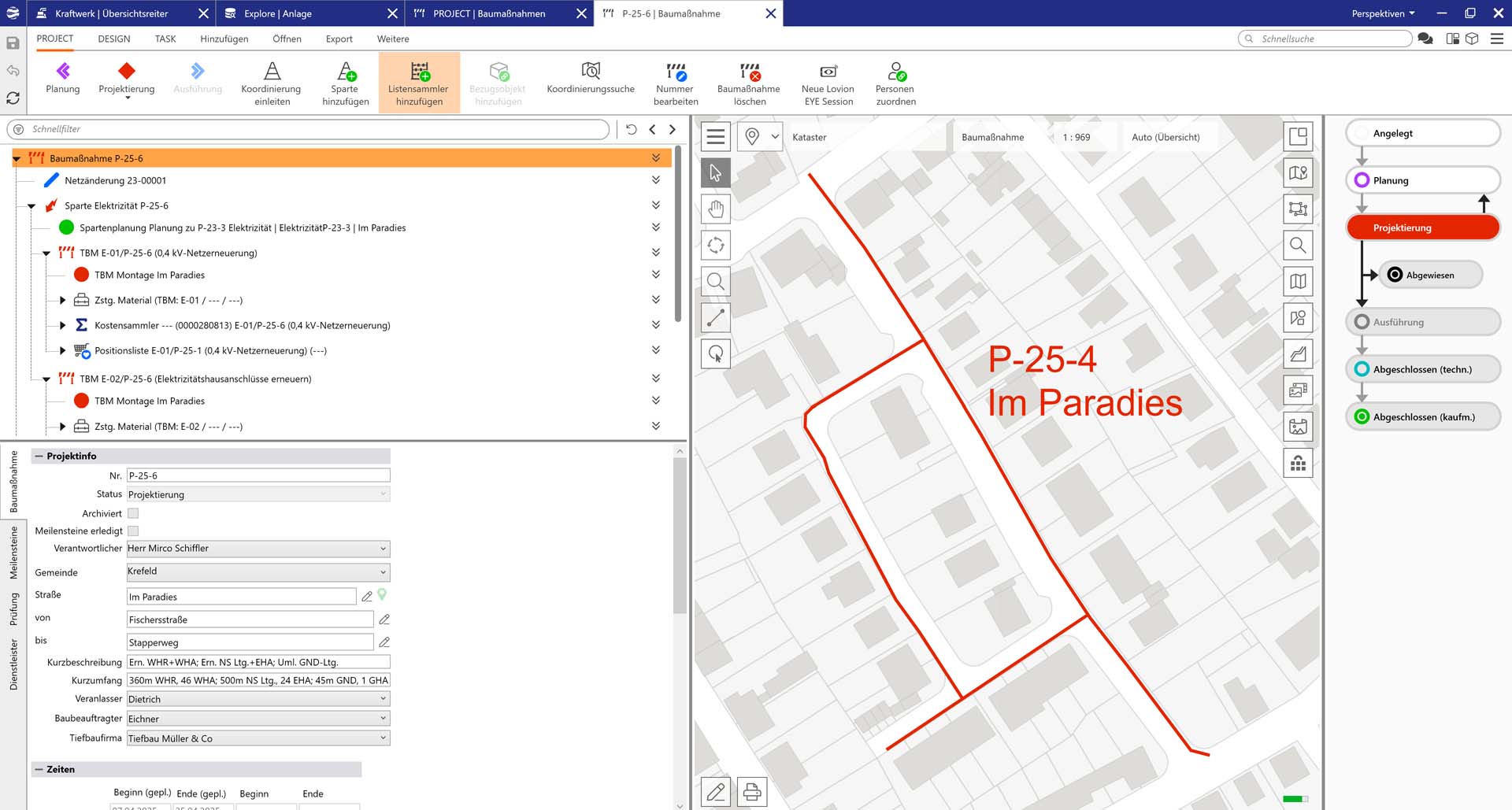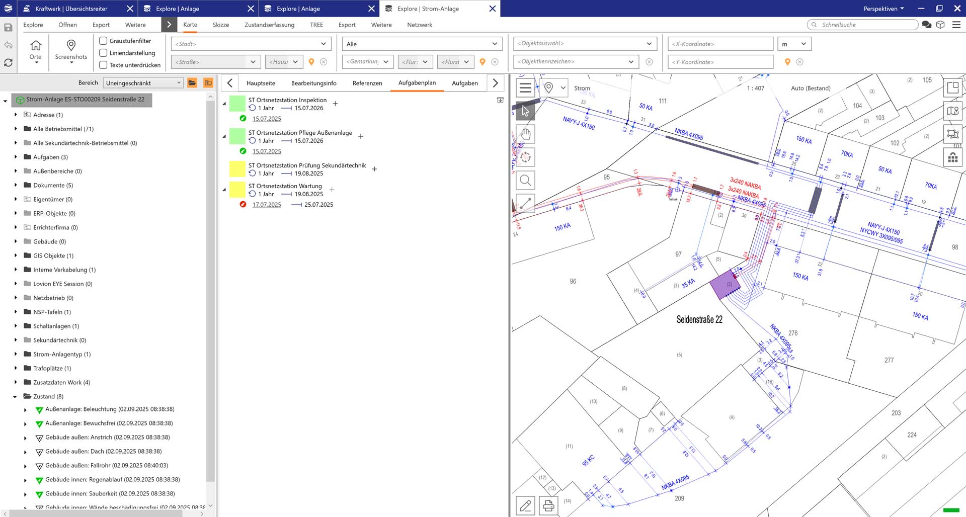 Beim Betrieb von Stromnetzen ist eine übersichtliche Darstellung der Schaltkreise wichtig. Das Modul Lovion ANALYZER kann auf Basis der dokumentierten Anlagen und Netze die Regelschalterstellung auswerten und Schaltkreise und Strecken einfärben. Wenn auch das Modul Lovion SWITCHBOARD  eingesetzt wird, können auch Schaltvorgänge simuliert, geplant und durchgeführt werden.