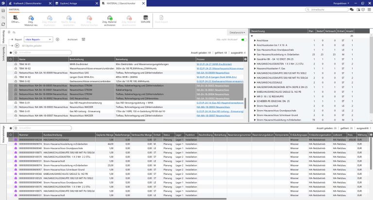 Die Materialplanung kann über das Modul Lovion MATERIAL funktional vollständig in die Ebene der Arbeitsvorbereitung integriert werden. Durch eine Integration mit dem ERP-System, zum Beispiel SAP, kann der Materialkatalog inklusive der aktuellen Bestände abgerufen werden. Auf diese Weise kann, wenn Arbeiten Material erfordern, dieses zusammengestellt und reserviert werden. Auch der Anstoß einer Beschaffung über das ERP-System ist dabei möglich.