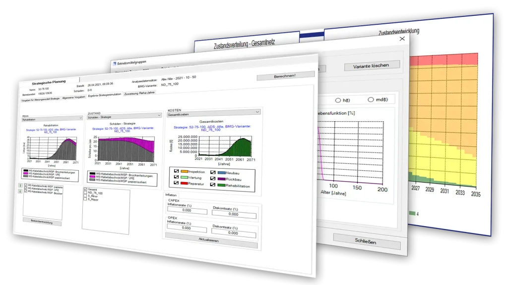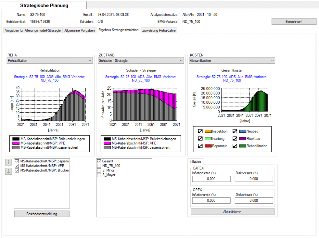 Jede Strategiesimulation liefert umfassende Ergebnisse zur Prognose der Rehabilitation, das heißt zum Austausch der Betriebsmittel, dem Zustand und der Kostenentwicklung unter Berücksichtigung von Inflation und Diskontsatz (Barwertbetrachtung). In Lovion LIFECYCLE besteht die Möglichkeit, die Ergebnisse von zwei oder mehreren Strategiesimulationen zu vergleichen. Für den Vergleich stehen dem Anwender aussagekräftige Diagramme oder Tabellen zur Verfügung, die über Exportfunktionen in weiteren Programmen verwendet werden können.