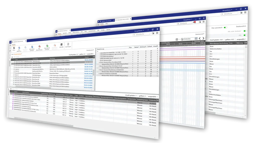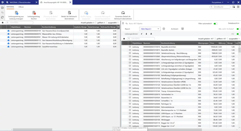 In Verbindung mit unseren Schnittstellen Technologien, wie z.B. Lovion ERP CONNECT, dienen die Materialzusammenstellungen dem Austausch mit dem Materialwirtschaftssystem. Hier kann dann z.B. Lagermaterial für eine Baumaßnahme oder Instandsetzungsaufgabe reserviert werden. Auch eine Übermittlung des Verbrauchs von Material an das ERP-System ist möglich.