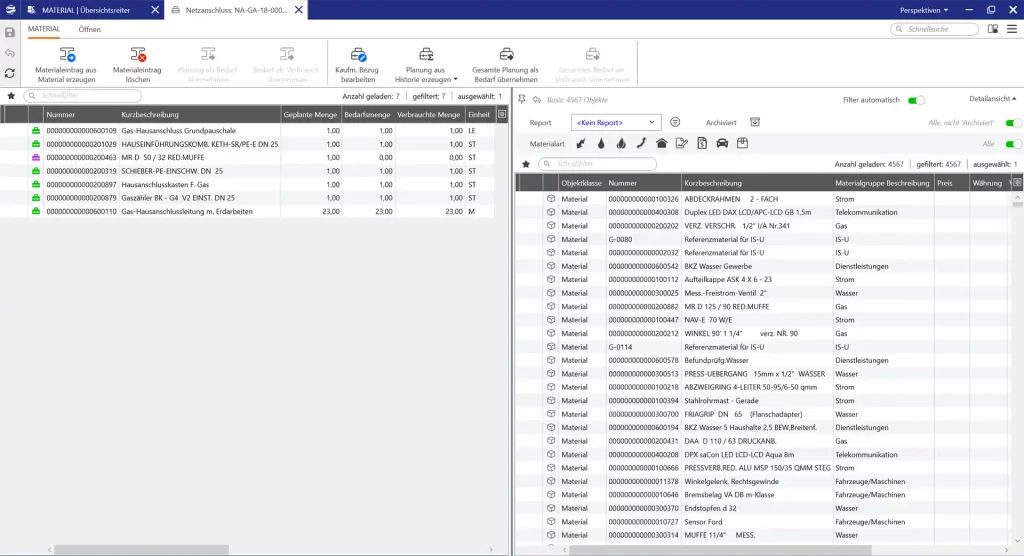 Das führende System für die Materialwirtschaft ist bei Netz- und Anlagenbetreibern im ERP-System, z.B. SAP MM, angesiedelt. Das Modul Lovion MATERIAL bietet die Möglichkeit, das Standardmaterialverzeichnis des ERP-Systems in Lovion abzubilden und über eine regelmäßig laufende Schnittstelle aktuell zu halten. Auf dieser Basis können Materialzusammenstellungen erstellt werden, die in den Prozessen zunächst zur mengenmäßigen Planung des Materialbedarfs dienen. Über entsprechende Schnittstellen kann im Anschluss auf dieser Grundlage auch eine Reservierung des Materials erfolgen. Zusätzlich kann, neben der Planung und dem Bedarf (Reservierung) auch der tatsächliche Verbrauch von Material dokumentiert werden.