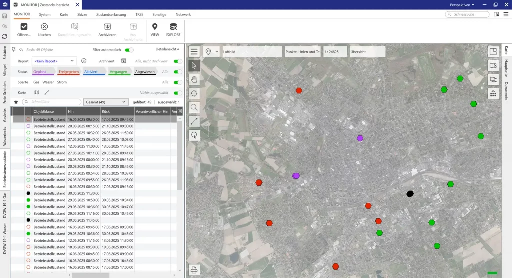 Im Außendienst dokumentierte Schäden und Mängel können in Lovion MONITOR gefiltert und in einer Listen- und Kartendarstellung ausgewertet werden. Wie in allen Lovion Modulen steuert der Status die weitere Bearbeitung. Als Folgeprozess kann entschieden werden, ob ein Schaden sofort behoben wird oder nicht. Auch die zyklische Beobachtung, zum Beispiel bei geringem Gasaustritt, wird unterstützt.