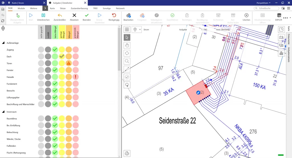 Schäden oder Mängel werden zum großen Teil bei der Durchführung von Wartungs- und Instandhaltungstätigkeiten festgestellt. Die Dokumentation erfolgt dann durch einen Außendienstmitarbeiter, der in Lovion TASK oder der Lovion TASK APP einen neuen Schaden meldet. Dabei kann er je nach Schadensart auch Fotos, Skizzen, Messwerte oder weiterführende Beschreibungen zu dem Zustandsobjekt erfassen.