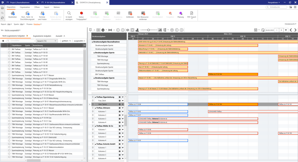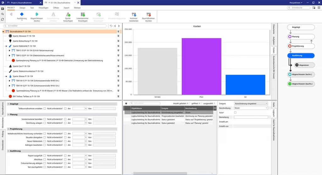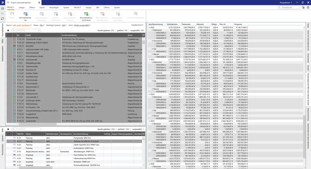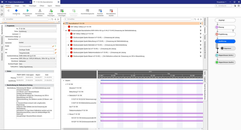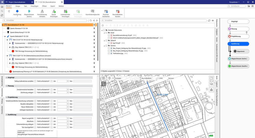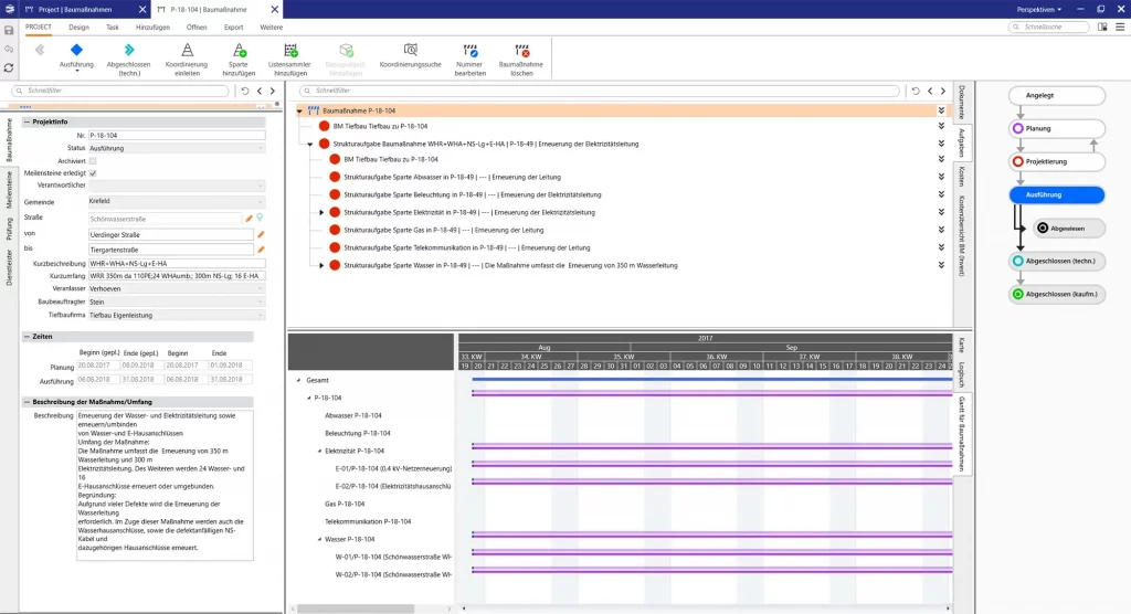 Die Strukturdaten einer Baumaßnahme werden hierarchisch auf Projektebene, den Sparten und den Teilbaumaßnahmen abgebildet. Die Teilbaumaßnahmen bilden die eigentlichen Tätigkeiten in einer Baumaßnahme ab und können sich je nach Sparte/Netzebene/Budgetart auf Anlagen, Netze oder Anschlüsse beziehen. Teilbaumaßnahmen haben in der Regel einen eindeutigen kaufmännischen Bezug, so dass hier die Kopplung mit dem ERP-System zur Abbildung zum Beispiel von Kosten, Auftragsstatus oder Bezügen zu technischen Objekten stattfindet.