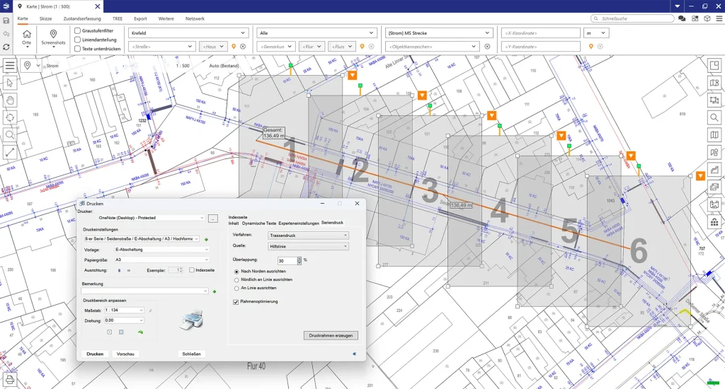 Der Multithemendruck ermöglicht dabei die Ausgabe mehrerer Themen in einem Druckvorgang. Über eine Seriendruckfunktion können auch mehrere Rahmen automatisch entlang einer Trasse definiert werden. Dabei kann auch eine prozentuale Überlappung sowie die Ausrichtung der Rahmen konfiguriert werden.